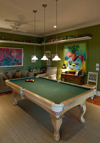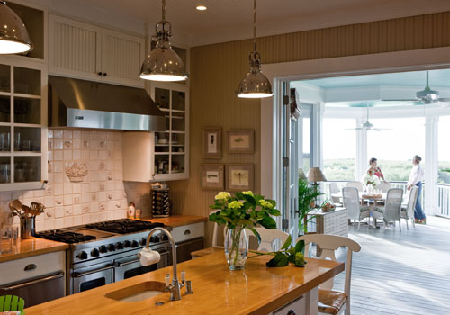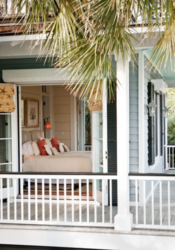 As for the latter, “I knew I wanted something that looked like Old Sullivan’s,” says Tippy. So she enlisted Chris Schmitt of Charleston’s Schmitt Walker Architects, who specializes in creating “old bones” looks with new construction. Tippy told him about her husband’s uncle’s rambling Sullivan’s Island home, how cozy it was, how all the kids and family hung out there. She also pointed out the Simmons’ house, a porch-wrapped abode on the island’s northern half and that she loved its rounded end-cap porches. She gave him a short list of prerequisites, too: Maximize the views; play up the glorious island light; marry indoor and outdoor living with deep, ample porches; don’t use a speck of drywall in the place; give generous wall space for artwork; fashion a “hers” master bath that forms a one-room getaway; and let the guest bedrooms have their own entrances outside so visitors can feel like they have private getaway suites.