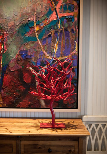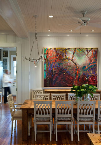 Come again? Apparently the fish are a typical party-night touch: Tippy adds water and betas to the blown-glass votives in her family room chandelier. But such quirky entertainment is de rigueur here. The Brickmans—who moved into the home full-time when they realized they were spending more nights on Sullivan’s than downtown and when they kept moving artwork out this way—host their fair share of funky, festive fêtes.