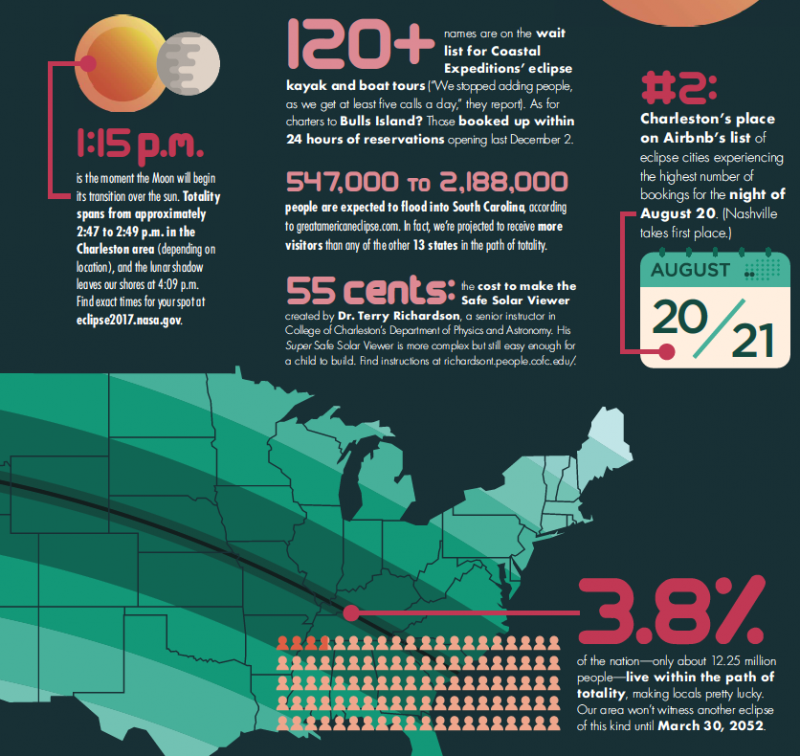 On August 21, at 2:47 p.m., the Moon will pass in front of the Sun, cloaking the Holy City in darkness. The “Great American Eclipse” is the first total solar eclipse to traverse the entire continent in 99 years, and it passes through Greenville, Columbia, and finally Charleston before heading into the Atlantic. Here, a look at some phenomenal figures