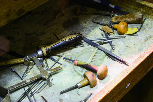 Though some clients bring specific designs to his workbench, including one woman who had him recreate a family brooch that had been stolen, Smolkin’s original creations are his hallmark. For rings, he casts wax molds that are often retooled