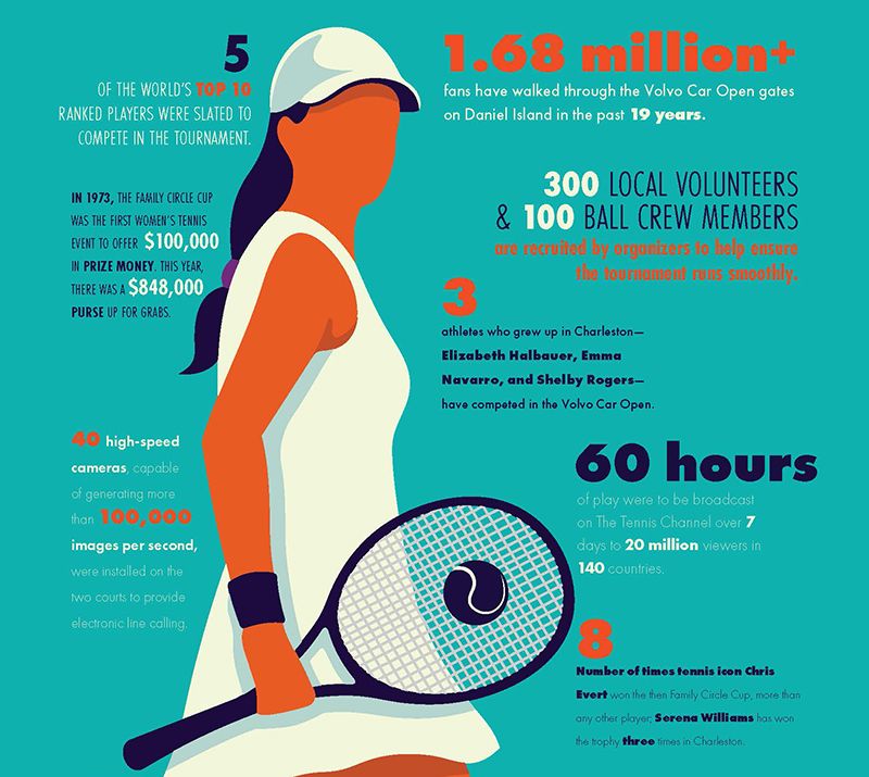 This year would have marked the 20th anniversary of Charleston hosting the Volvo Car Open, which moved to Daniel Island from Hilton Head in 2001 and changed its name from the Family Circle Cup in 2015. Though we’ll be missing the action on the courts (it was canceled due to COVID-19 precautions), we crunched the numbers for what has been the largest women’s only tennis tournament in North America, traditionally attracting more than 90,000 spectators.