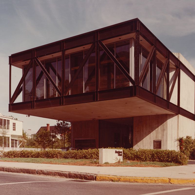 Jeffrey Roseblum’s orders were clear: design a building that would distinguish Bankers Trust from any other bank in the area. And he delivered. In 1973, what was then Rosenblum and Associates Architects abandoned historic influences to create a signature, modern office for Bankers Trust at Calhoun and Gadsden streets. Defying tradition in style and construction, the firm cantilevered the steel and cement structure to appease zoning regulations by allowing cars to park beneath it. Upon its completion in 1974, the reviews were mixed. Jonathan Poston, preservationist and author of The Buildings of Charleston, says that while staunch traditionalists disliked the “unapologetically modern” structure dubbed the “floating bank,” many appreciated the convenient drive-thru and unique design. Since August 2009, after 35 years of use by Bankers Trust and Bank of America, the building has sat empty. Although its future remains unclear, Rosenblum believes that this unique space offers limitless potential for anything from a coffee shop to a law office.