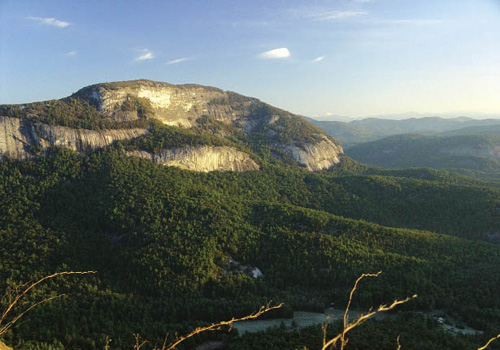 The Cashiers Area Chamber of Commerce, with a stock of maps and pamphlets describing local beauty spots, made it easy to drive from waterfall to waterfall. I plotted a course that zigged and zagged to the north and south as well as east and west of town. I found the best place to get the lay of the land is Whiteside Mountain, just five miles west of Cashiers. This massive outcropping of granitic gneiss rock rises majestically from the upland forest to an elevation of 4,930 feet and provides not only spectacular views into neighboring states but also an ecosystem capable of supporting endangered peregrine falcons and dozens of colorful wildflower species.