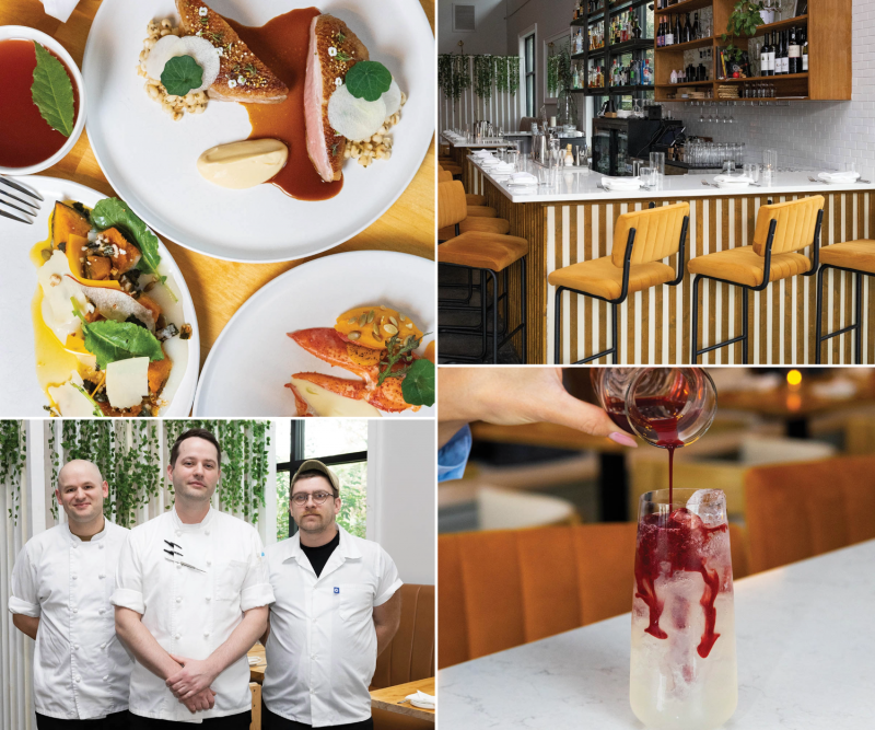(Clockwise from top left) Kabocha salad with pear and parmigiana; duck with pearl barley, rutabaga, and apple cider jus; lobster with mandarin, pumpkin, and citrus beurre blanc; the Harvest Moon cocktail; chefs Brandon Andrist, Zach Woody, and Jaison Browder