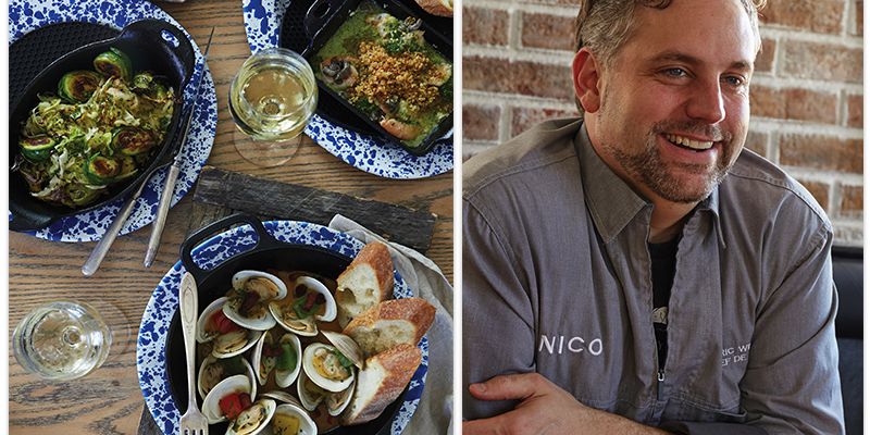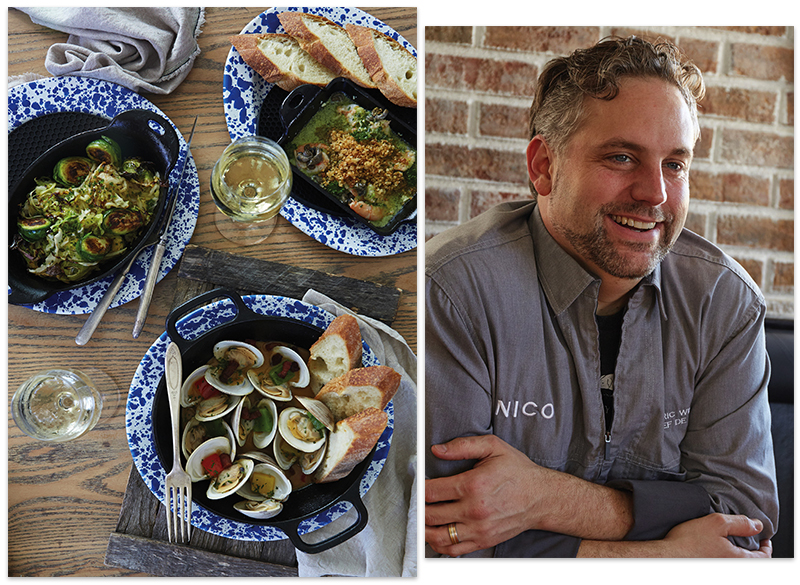 PHOTO: (left) Blue-and-white enamel plates and cast-iron cookware frame NICO’s offerings, including (clockwise from top left) roasted Brussels sprouts and shallots, a shrimp and periwinkle snail starter, and baked clams in a bacon broth. (right) Chef Nico Romo serves up seafood dishes prepared in classic French style.