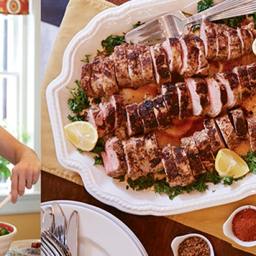 Around the holidays she likes to make dishes that could be prepared any time of year, but look festive. Cornish game hens with cherry wine sauce make for a photo-worthy centerpiece, but it’s 15-year-old Graham who provides her real source of inspiration. “My son loves cherries!” she says. Brussels sprouts and spaghetti squash also get starring roles, a dietary choice Melissa Ann makes as a nod to her family’s efforts to eat flavorful albeit healthier meals. But the saying “everything in moderation, including moderation” is worth remembering when tucking into Melissa Ann’s dessert. Her Caramel Glazed Kahlua Gingerbread Loaf with Peppermint Ice Cream comes courtesy of Emmylou.