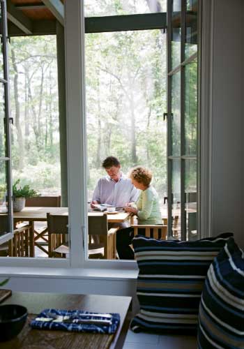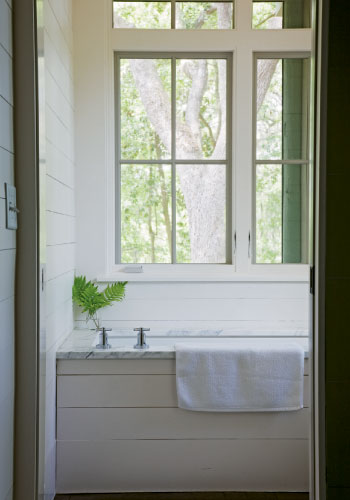 In the end, the place delivers just what the Beasleys craved. “We wanted something manageable and to feel like we were outdoors as much as possible,” says Charles, of the final mix of fresh-air living spaces and ample windows framing the lush landscape. “My favorite part is the upstairs porch and sitting room,” adds Eleanor. “It’s so peaceful up there. The sun sets on the tenth-hole pond, and it’s just like being in a tree house—a really, really comfortable tree house.