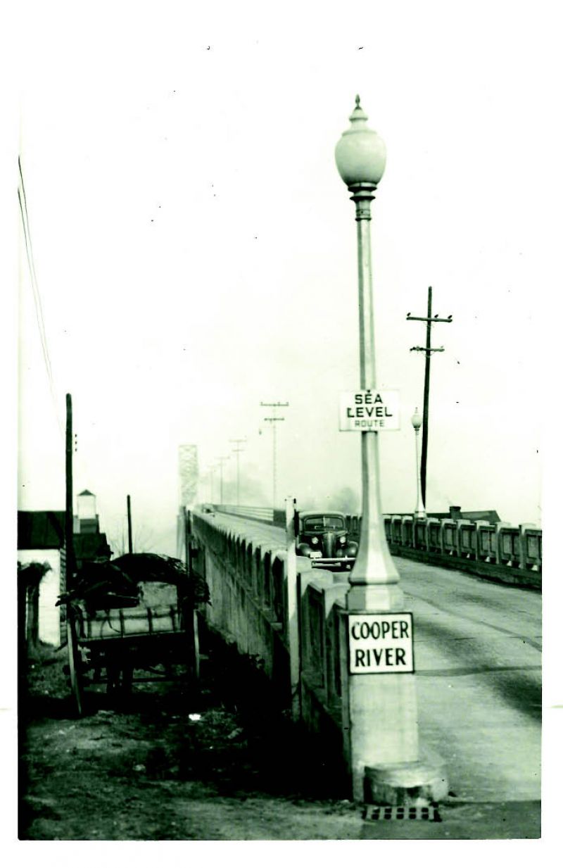 Opened in 1929, the Cooper River Bridge (John P. Grace Memorial Bridge), shown here, was itself a lure. Two miles long and 150 feet high, it was the fifth largest cantilevered bridge in the world and touted as an “impressive structure… towering over historic Charleston.” Back then you paid a 50-cent toll to cross. But on a roadbed only 20-feet wide with no white lines down the middle, this two-way roller-coaster ride often stranded scared drivers at the top of the span, with passing locals regularly coming to their rescue. As one white-knuckled rider yelled to this writer’s father on a drive across the bridge, one had to “watch them hubcaps!”