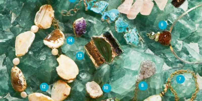 1. Leather cuff with jade stones, $89 at Biton 2. Bracelet featuring turquoise set in sterling silver with a toggle closure, $228 at Handpicked 3. Sapphire pendant on a 14K gold chain, $74 at Poe Studio 4. Rose quartz necklace, $115 at Dixie Dunbar Studio 5. Lava rock pendant on a sterling silver chain, $89 at Aster Hall 6. Sterling silver choker with brown drusy, lime quartz, and pearl stones, $315 at Aster Hall 7. Peruvian opal pendant with freshwater pearl and turquoise detail on a 24K gold chain, $215 at Filigree 8. Teardrop-shaped agate pendant on a 14K gold chain necklace, $175 at Out of Hand 9. Sterling silver-framed bracelet set with turquoise and jade stones, $395 at Aster Hall 10. Dara Ettinger “Bridget” oversize chalcedony drusy ring set in 24K gold, $85 at Seeking Indigo 11. Green garnet slab pendant necklace on a 14K gold chain, $65 at Dee Ruel 12. White agate necklace with a 14K gold clasp, $175 at Out of Hand 13. Sterling silver cuff with green agate stone, $99 at Willy Jay’s 14. Dara Ettinger oversize amethyst crystal ring set in 24K gold, $85 at Seeking Indigo