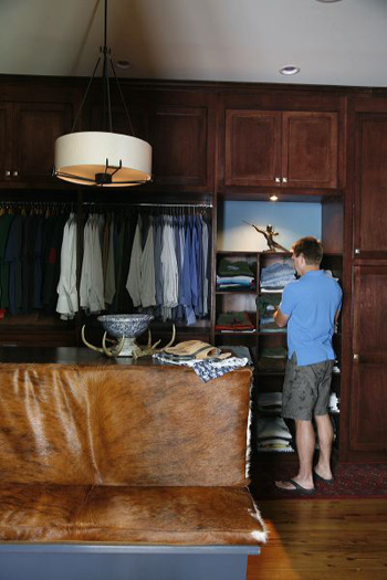Upstairs, the pair sacrificed guest room square footage to add more depth to the master suite, which also sports a nearly unobstructed view over the Ashley and a porch with a hanging bed, known as “the best place to read in the house,” according to Doug. Toss in a spacious dressing room and a steam shower with a tile floor that mimics a mosaic pattern the well-traveled pair saw abroad, and it’s an enviable set-up. Interior designer and friend Carol Lund stepped in to help streamline their look, which features a neutral, masculine palette; dark wood furniture; hand-woven rugs; and natural materials like hides and leather.