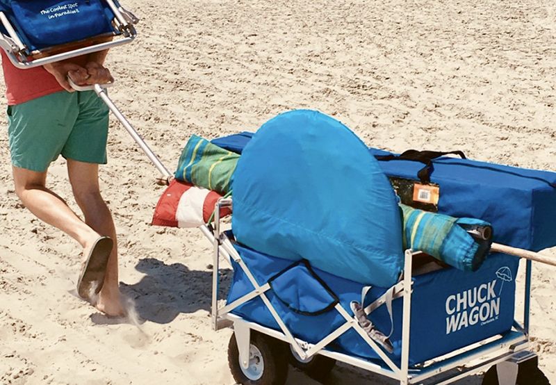 Necessity, says John McCollum, inspired him to create the Chuck Wagon, a Charleston-based beach cart biz. “My wife has rosacea, so we always have to haul an umbrella to the beach.” The couple struggled to find a wagon that could do the heavy lifting; many were quick to rust, and carts with plastic or solid rubber tires often turned into sleds. The Navy veteran also wanted a beach cart that didn’t nip your feet while trudging through hot sands. So, he rolled out the Chuck Wagon, a smart carryall with a rust-resistant, collapsible aluminum frame and sturdy, balloon pneumatic tires that make it lightweight and able to traverse uneven terrain. There’s even an extended handle to keep heels safe. At $350 a pop, the Chuck Wagon is a splurge, but one worthwhile for avid beachgoers.