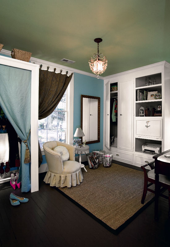 When faced with the task of giving new purpose to an oddly sized spare room, interior designers Angie Artigues and Terri Baldwin looked past an old electric pink backdrop. “The main problem with this space was that there was no particular function to it,” says Baldwin, noting that it was originally part of a larger bedroom that had been split in two. “This room is considerably smaller than the other and became a catch-all for everything.” The duo set out to transform the awkward space into feminine dressing quarters, updated for a busy mom’s schedule. Along with providing ample room for her everyday wardrobe, they incorporated storage for out-of-season clothes, a vanity table, and even a computer workstation. Bright pink wall paint dominated the tight quarters, making the room seem even more cramped. Awkward dimensions make it difficult to assign a definitive purpose to the space, while bare windows made the room appear cold and impersonal. Built in the early 20th century, the house lacks storage closets, so clutter builds up quickly. 1. Keep It Behind Closed Doors: Priority one was giving the owner’s various wardrobe and dressing items a place of their own. This secondary closet, closed off by sea-green fabric panels, offers storage for off-season clothing and shoes. 2. Create a Sense of Privacy: The designers used leftover fabric belonging to the homeowner to fashion a single tieback curtain for the window, which shields the room from harsh light and exposure to passersby. “The windows in this old house stretch very low to the floor, so we also added a window seat to address the odd proportions,” says Baldwin. 3. Become a Bargain Hunter: The main light source in the room was a bare lightbulb that hung from the ceiling and was operated by a pull cord. Baldwin and Artigues opted for an inexpensive replacement in the form of this petite chandelier from Lowe’s, along with a reading lamp on an end table. 4. Make It Practical: Updating the idea of a woman’s private dressing quarters, the design team included a fold-down desk for her workstation in the plan. “Every time the owner wanted to work on her computer, she’d have to clear off space at the kitchen table,” says Artigues. “This room gives her laptop and printer a permanent spot in the house.” 5. & 6. Fine Tune the Details: The designers spotted several mismatched vintage doorknobs and decided to put them to work. One serves as a tieback for the curtain, which hangs from a handful of other knobs installed in a row along the top of the window frame. In the closet, an old magazine rack is repurposed to hold shoes. Budget Snapshot A look at the designers’ key investments: • Paint & painting supplies: $119.84 • Construction of storage closets: $222.28 (materials); $850 (labor) • Reupholstery: $75 • Area rug: $50 • Light fixture: $84 Where they shopped: • Lowe’s, Currents (Pawley’s Island), Celadon, and Ross