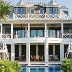 When they’re not in motion, the family finds respite in their posh beachfront abode. Situated between shoreline and maritime forest, the nearly 6,500-square-foot shingle-style structure is hemmed in by a canopy of centuries-old oaks on one side and a stretch of sand on the other. The sophisticated interiors create a luxe oasis where French linen sheers flutter in the breeze, pedigreed antiques mingle with contemporary pieces, and a spiral staircase rises three stories to the family’s private quarters. Beautiful custom architectural details, such as an embellished ceiling in the living room and cypress wet bar off the living room, create further visual interest throughout.
