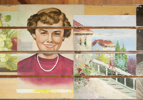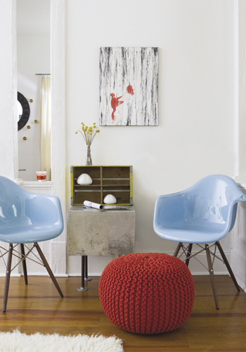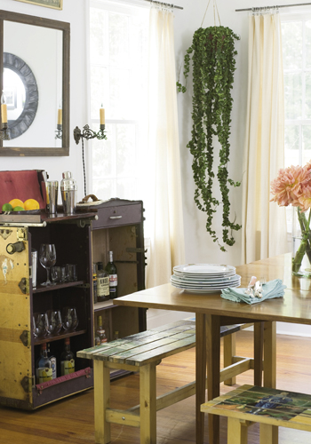 In came pieces she’d found, made, or spiffed up over the past few years, plus some new stuff—a low-slung sofa from CB2, a pair of blue, fiberglass Eames reproduction chairs, a stainless-steel kitchen island from an online restaurant supply shop—mixed in to shake and shine things up. But mostly, the trappings are Ann Ladson’s made-over versions: a pair of plain-Jane benches decoupaged with canvas paintings, a trunk John’s grandmother took with her to boarding school now outfitted with metal casters and put to use as a coffee table, a poster from a 1950s schoolroom mounted on a plastic pull-down shade in the dining room.