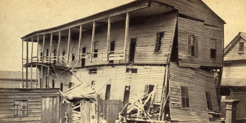 By the time Charleston Renaissance writer John Bennett published his 1946 compilation of Gullah folktales and legends, The Doctor to the Dead, the Trapman Hospital (featured in three of his stories, and pictured here) no longer existed. The building—a Civil War hospital-turned-rental property—was one of many structures destroyed in the city’s catastrophic 1886 earthquake and subsequently immortalized in George LaGrange Cook’s photo series, “Cook’s Earthquake Views of Charleston and Vicinity.” Stories about the edifice also live on through Bennett’s book; though as a white man he may have reinterpreted some of the Gullah fables through a traditional, Gothic lens to appeal to a broader audience, the writer stated that he sought to preserve “remnants of a body of folklore already far decayed and rapidly passing out of existence.” For legends about the edifice that was widely suspected to be haunted, Bennett interviewed washerwoman and former tenant, Mary Simmons, who regaled him with tales of specter soldiers that had perished in the hospital, still begging for water, or in some cases, drinking straight out of the buckets near the well. She suggested that after the building was dismantled nothing would grow on the soil left behind, not even weeds. Houses now stand on the once-barren land at the corner of Trapman Street and Trumbo Court, and though the hospital may be gone, stories like “The Thirsty Dead” survive in the tome documented by Simmons and Bennett.