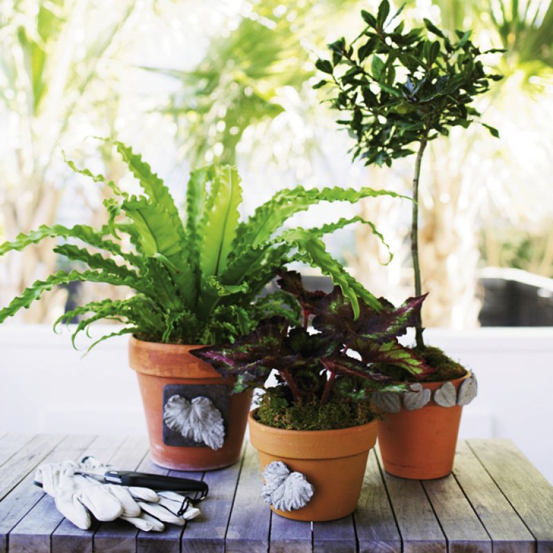 This easy, inexpensive project breathes new life into the ubiquitous terra cotta pots, giving the garden staples a sophisticated look with three-dimensional, botanical interest. For our trio (opposite page), we selected foliage from begonia and peperomia plants, but any leaves with pronounced veining will do. Cast them in mortar to create a permanent impression reminiscent of a fossil. Apply the cast leaves to the pots with glue or wire hangers, et voilà, a great new vignette for your porch or patio. Be sure to allow yourself two days to complete this project (the mortar has to set overnight) and find an outdoor workspace that has a water source and can get a little messy. Once you get the hang of the process, you can take this to a larger scale and really let your creativity show.