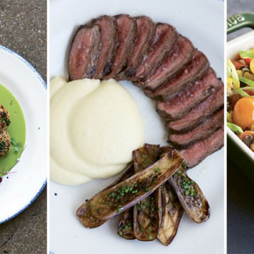 Variety Hour: (Left to right) Beef short rib with romesco and chimichurri; cabbage gratiné; roasted chicken with sweet potatoes and apples