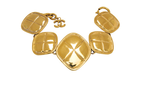 From 1970s chic to 21st-century classic: this quilted gold- tone bracelet dangles its Chanel logo daintily from the clasp. $700 from Library Archives of Fashion