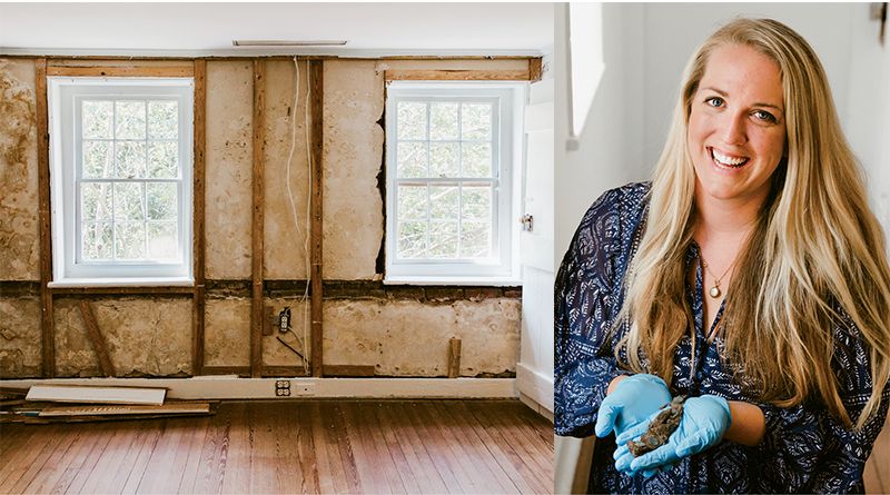 (Left) Historic Charleston Foundation (HCF) found original plaster hiding behind 20th-century drywall in former enslaved living quarters at the Nathaniel Russell House Museum. (Right) HCF’s Lauren Northup holds part of an enslaved butler’s wool and silk livery waistcoat, complete with brass buttons.