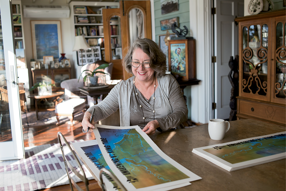 Skulls aside, Fraser’s studio is filled with evidence of her prodigious energy. Her signature silk batiks—ethereal interpretations of undulating coastlines, mountain-scapes, and serpentine waterways—hang in long, graceful verticals. Books that she’s illustrated on climate change and barrier islands populate tabletops; file cabinets are filled with paper trails from decades of museum shows, commissions, and grants; a gallery wall showcases framed giclées and monotypes. And in the midst there are two large canvases where Fraser’s putting finishing touches on something new—her first large-scale aerial oil paintings.