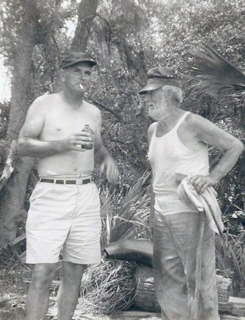 When that property was sold for development, they moved across the water to Goat, constructing a “house” of driftwood and tree boughs. Growing veggies, drinking rain water flavored with goat’s milk, and enjoying supplies dropped off by kind citizens (such as John Midgett, pictured above, left), they subsisted there right up till their deaths in the early ’60s.