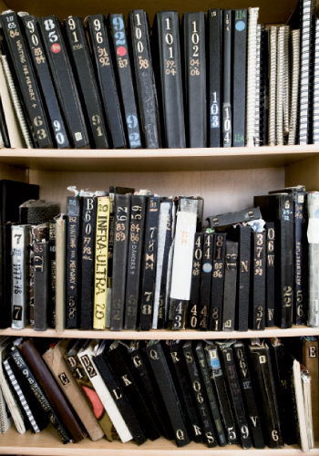 There were boxes upon boxes, then more boxes. Crates stacked on crates. Inside were carefully wrapped canvases, delicate collages, various sculptures, Plexiglas installations. Watercolors, pen washes, oils, and charcoals; woodcuts, etchings, lithographs, and trays upon trays of 35 mm slides. Paintings with 1950s museum tags still on them. And journals. Shelves of dated and numbered journals—six decades worth of ideas, sketches, designs, questions, commentary, to-do lists (“measure the Hudson River”), scattered thoughts, scribbled dreams, articulate rants, and gorgeously rendered fantasies. An artist’s frisky and fantastic mind spilled out on pages and pages, a compulsive creator’s catalogued journey.