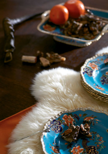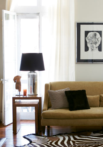 She’d been living in hotels for years and was used to turndown service and mints on the pillow, not decorating. But it didn’t take long for Kim’s predilection for “shiny things” (silver vessels, crystal chandeliers, and brass-tinged lamps) and “textures” (furs, hides, velvets, feather bouquets, and high-gloss walls) to meld with Alex’s family-born art collection (photos from Uncle Alan Siegel, a nationally renowned collector; batiks from Grandmother Lucille Burroughs Quattlebaum; and sketches inherited from his mother) and antiques (like the well-loved kitchen table he grew up with).