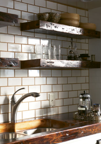 In the back guesthouse, which had once served as a kitchen and carriage house, Kim and a girlfriend refinished the ground floor, staining the cement and sealing it with epoxy. Contractors removed old beams upstairs and fashioned the salvaged antique wood into countertops in the downstairs kitchen and vanities, benches, and more throughout the two-story space.