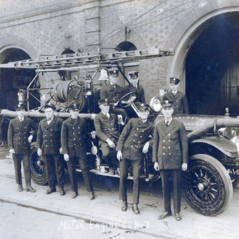 Here’s a fun fact: the Charleston Fire Department purchased the South’s third motorized fire engine in 1910—just following departments in Augusta and Macon, Georgia. Unleashing 700 gallons per minute, the Webb combination fire engine and hose wagon easily outperformed its predecessor, the horse-drawn steam engine. In a 1915 report, local Firemasters chairman Charles Valk affirmed the engine’s superiority—“besides relieving a number of men from the care of horses, acting as stokers for fire duty, these motor machines can cover three times the territory in much less time”—and urged Mayor John P. Grace to purchase additional units. But at $10,000 (approximately $235,082 today), the engines were not cheap. As a result, the department did not become fully motorized until 1926, around the time that this photo of Charleston Motor Engine Company No. 7 and its American-La France triple combination engine was taken. You may recognize the 5 Cannon Street fire station in the background; built in 1888, it is one of the city’s oldest.