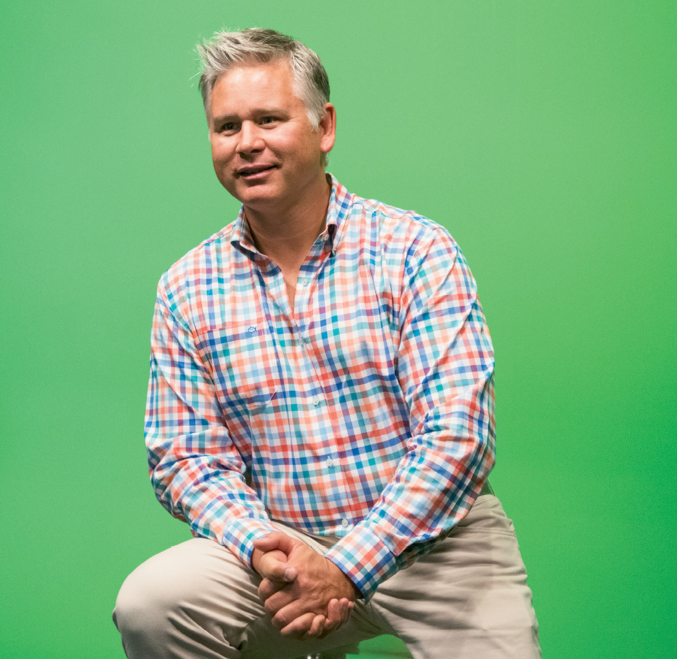 Black Bear Studios cofounder Warren Ostergard poses in front of the green screen.