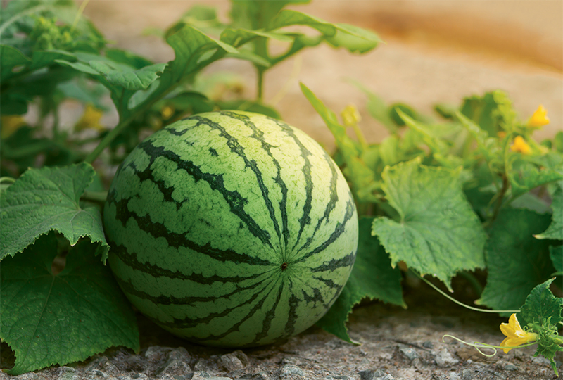 Melons require loads of H2O, and—to avoid splitting—they need it on a consistent basis. Drip irrigation works best, delivering refreshment to the root zone while keeping foliage dry, thus cutting down on disease.