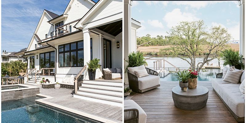 One of their chief wishes was for the house to fully embrace the landscape on which it sits. For that, they turned to architect Damien Busillo of DLB Custom Home Design, who’s been designing waterfront residences throughout the Lowcountry for more than a decade. “We situated the house as close to the rear of the property as possible while still abiding by design review guidelines,” explains Busillo, who worked hand-in-hand with builder Roy Mahshie of Mahshie Custom Homes throughout the process. “This allowed for panoramic views of the marsh without being hindered by neighboring properties.” Indeed: standing in the pool looking out toward the water, it seems like one could be floating in the tidal creek itself.