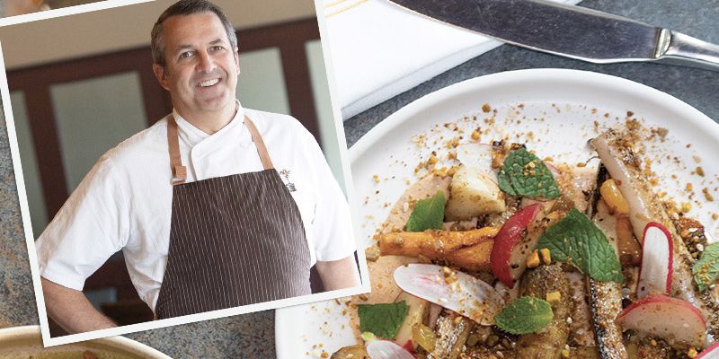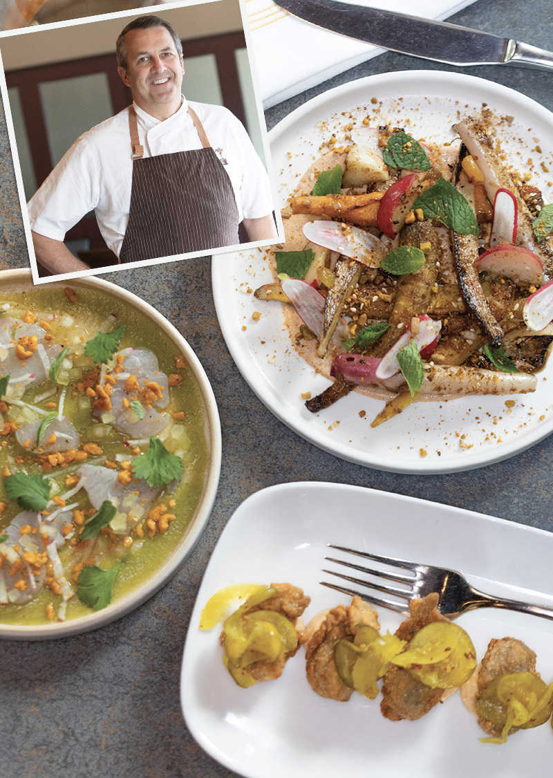 Flavor Medley: (Clockwise from top) Autumn roots with harissa yogurt and pistachios; cornmeal-dusted oysters, deviled egg sauce, and pickles; mackerel crudo with Granny Smiths, jalapeño, lime, and spiced peanuts; (Inset) The Thinker: Six-time James Beard nominated chef Kevin Johnson
