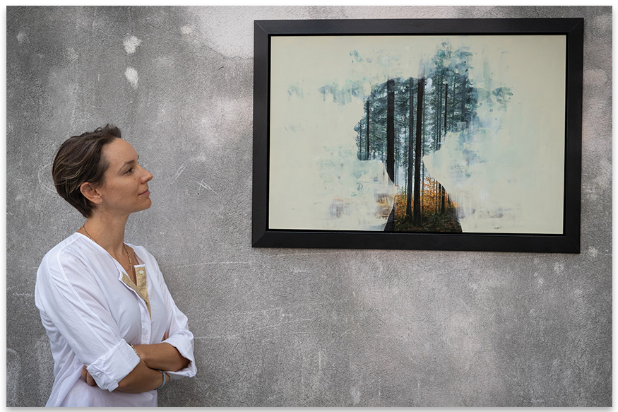 Artist Megan Aline has been working on a series called “Inner Landscapes” depicting feminine silhouettes filled with wooded scenes, such as Constantly Growing (acrylic on panel, 20 x 30 inches, 2021).