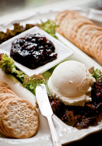 The group settles in for appetizers: table water crackers layered with goat cheese and homemade hot pepper jelly. The warmth from the ancho and chipotle chiles balances the cheese in this creamy, robust snack that even draws the attention of young Milo.