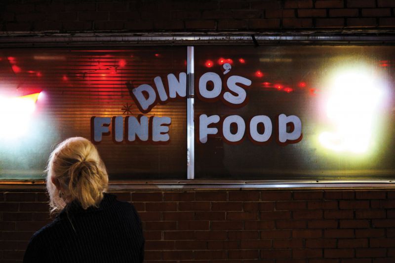Musician Arum Rae under one of the Dolly Parton portraits at Dino’s, a dive bar in East Nashville.