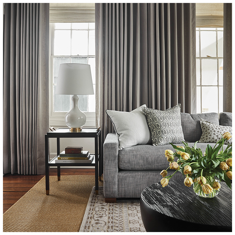 The light-filled living room features warm touches, from a neutral rug and pale gray drapes to a coffee-colored mohair chair from McGee & Co. The theme is balanced by a custom sofa covered in a gray performance fabric from Perennials and black accent pieces. The round “Maureen” coffee table, also from McGee & Co., allows for easier flow in the compact space.