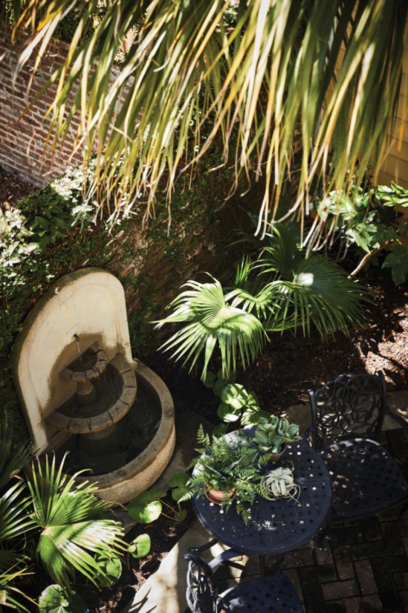 Secret Garden: While the house is set back from the street courtesy of a large front yard with manicured boxwoods, this secluded terrace, tucked behind the home’s double piazzas, features lush palms and a fountain, providing a serene, private oasis.