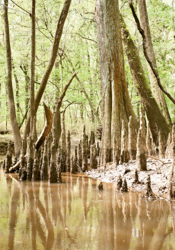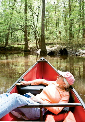 The wild sounds and sights would keep coming. On the slow-flowing blackwater of Cedar Creek, we glided past wide-bottomed cypress trees, their buttressed, smooth trunks twisted into arches or wrapped around one another before rising upward 100 feet and more. The glassy water allowed for mirror images of the trunks, reflection pools in a natural sculpture garden. After paddling and floating a while, I spied a bird fly through the trees in a flash of white and red. It must have been a pileated woodpecker, one of the largest in North America.