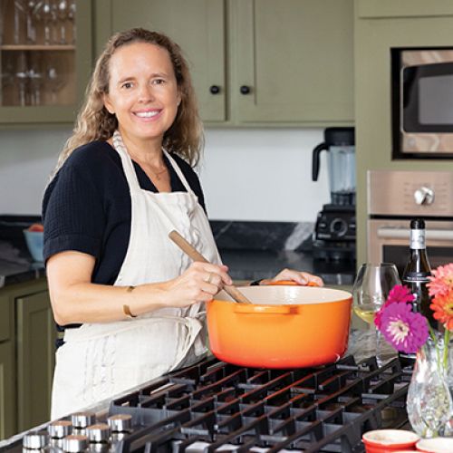 The writer, restaurateur, and sommelier in her kitchen, testing her shrimp and white bean recipe.