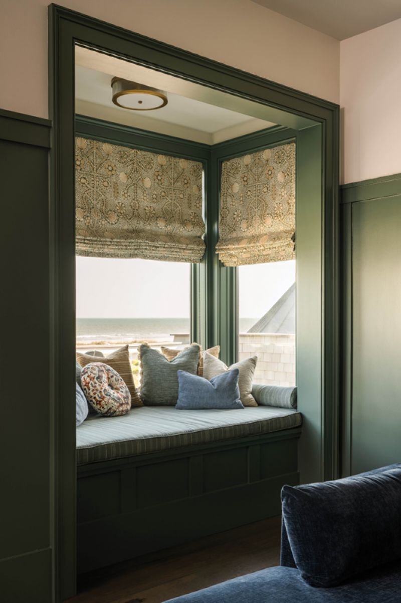 A window seat and comfy leather chair from Robin Bruce create additional cozy spaces in the room.