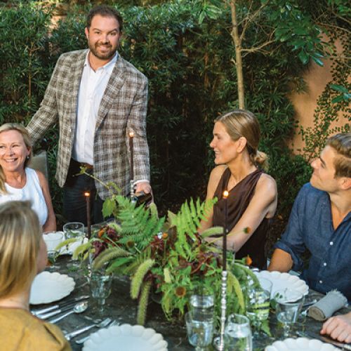 Tucked inside the entryway, a well-stocked bar and the evening’s batched honey-basil margarita sit atop an antique sideboard.