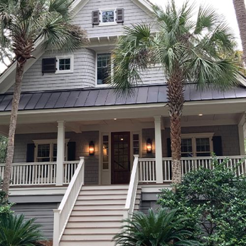 Live, Work, PLay: Kristin Peake and David Smith bought this Kiawah Island cottage in 2019 as both a retreat from their busy lives in Maryland and a Southern office for her interior design business. The project involved a complete renovation inside and out, including a new roof and front door; the addition of shutters and columns; and a gray, white, and charcoal exterior paint palette.