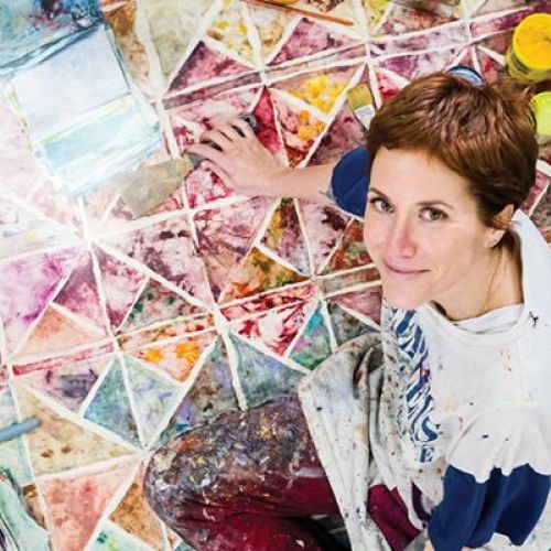 In an effort to make her studio more sustainable, painter Katy Mixon started reusing the paint-stained rags she was throwing away to create colorful quilts, such as The rain bows and the rainbows (one day we will switch sides), which she is sitting on here.