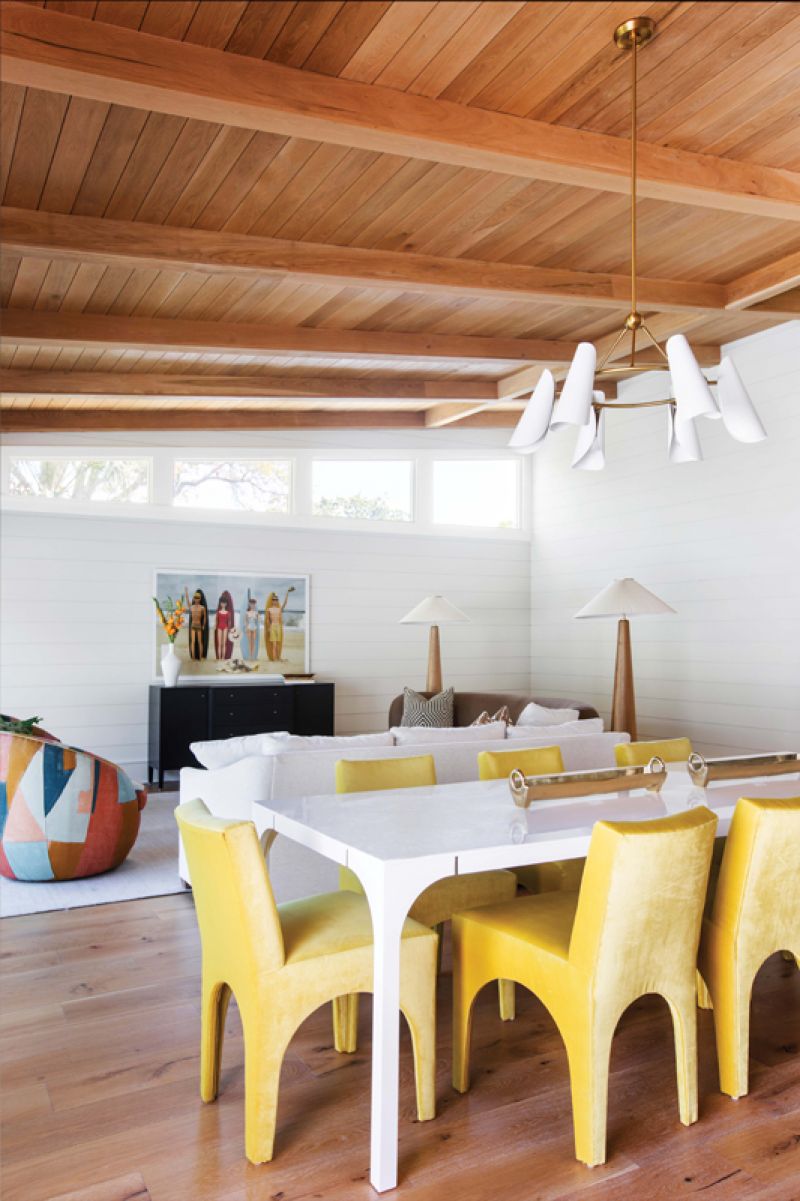 Color-block party: In the open living and dining area, Jones embraced Claire’s love of color with bright yellow velvet dining chairs. “We searched high and low for the perfect yellow velvet that could withstand young kids, the beach, and lots of entertaining,” says Jones. In the living room, Coley Home chairs covered in a Kelly Wearstler color-block fabric reinforce the vintage feel, accented by the curved brown sofa; floor lamps from Celadon; and Montauk Surf Club, a Barbie-focused digital artwork by David Parise.