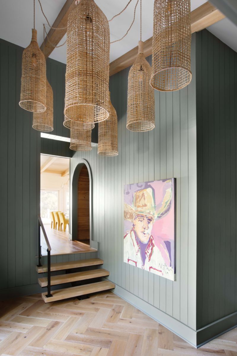 Claire stands in the home’s custom steel front door with Charleston-based artist Nathan McClements’ cowboy art behind her.