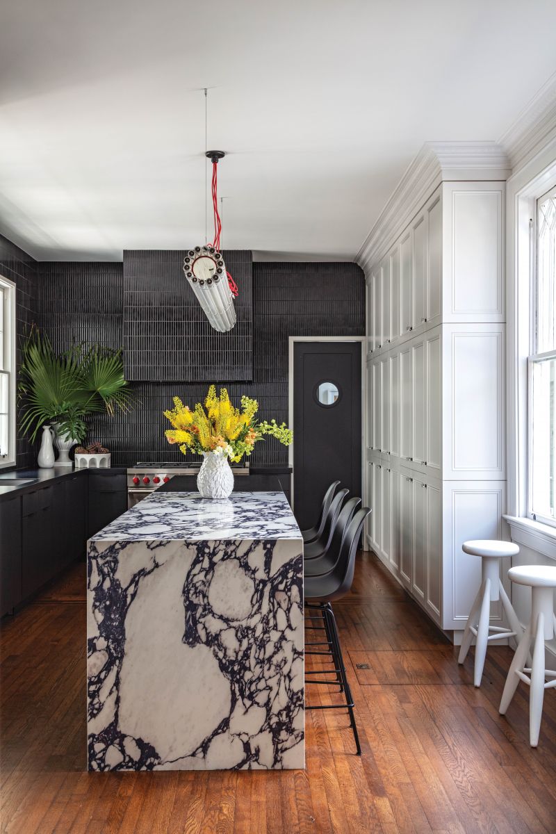 The mahogany newel post, shaped like a lighthouse, harkens to the city’s port heritage, while the front door, painted a deep Dutch black, connects visually to the kitchen beyond.