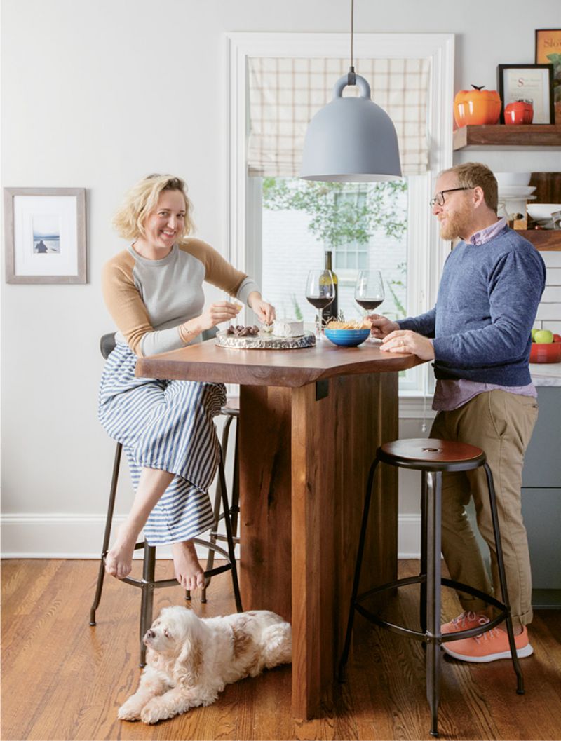 BEST SEAT IN THE HOUSE: The renovated kitchen is too small for a proper island, but no matter: a walnut bar fabricated by a close family friend delivers similar functionality. “This has become probably my favorite part of the house,” Jacques says. “It’s a great place for less formal meals or catching up while one of us is cooking.”