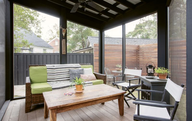 PRIME PERCH: Just off the back deck, an angular screened-in porch makes the most of the triangular lot; its tin roof adds an industrial touch that feels perfectly in step with the rest of the modern-minded renovation. “I’m so glad we made the screened-in porch happen: I love being outside, but the no-seeums drive me nuts,” Jacques says. “There’s nothing better than sitting on the couch outside, listening to the wind blow, birds sing, and children playing in the neighborhood.”