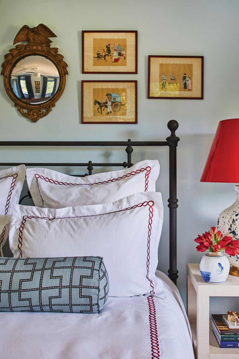 Lush Layers: In the primary bedroom, Cooper mixed chintz and men’s suiting fabric for a traditional bed canopy, which helped address the room’s odd angles. The oversize lantern, which originally hung outside a downtown home, was sourced at Wynsum Antiques.
